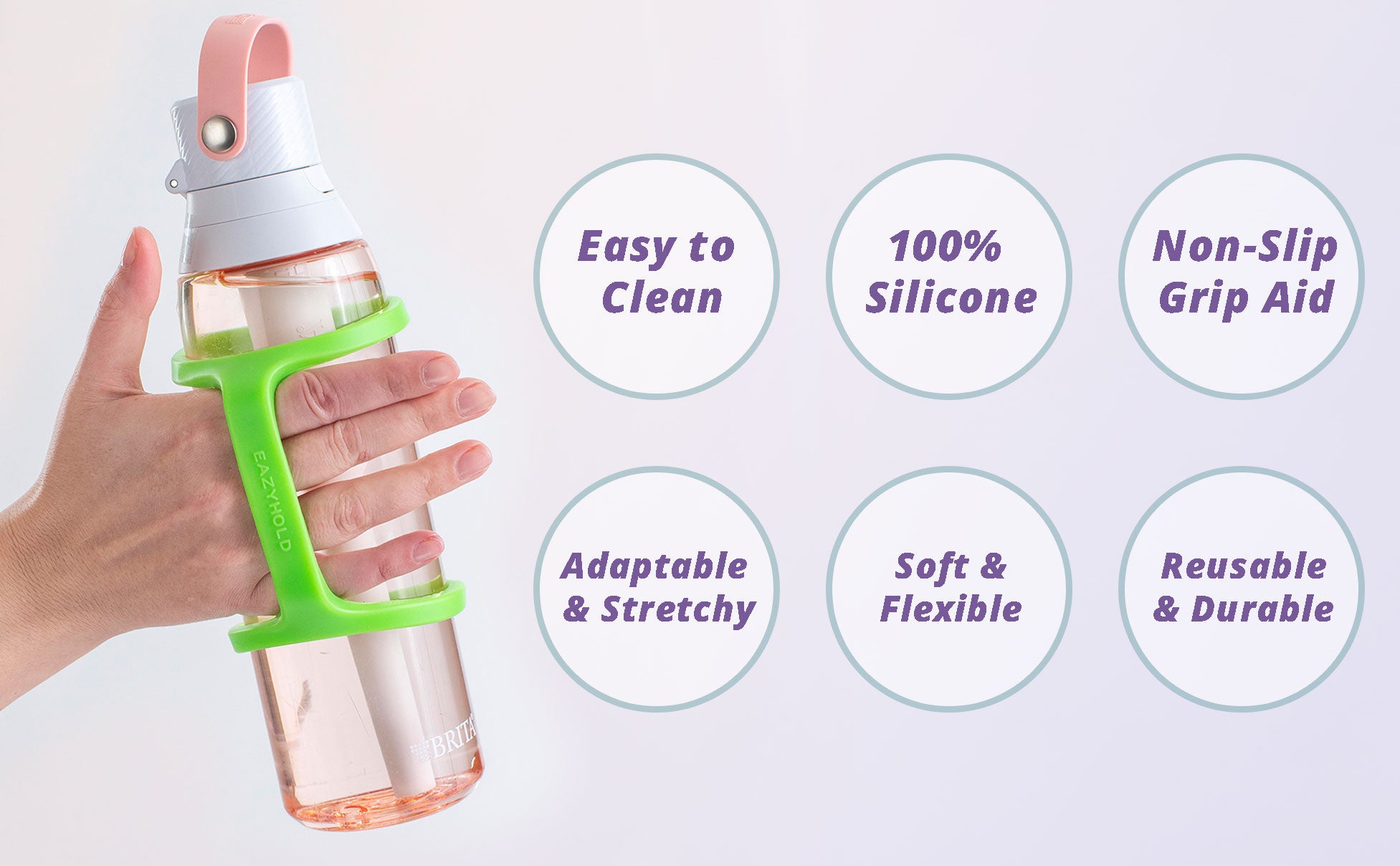 Made of soft stretchy silicone which warms to skin temperature and does not need to be tight on the hand to support the item. Flexible handles, ergonomic fit, easy-grip for hands to grasp and hold, flexible so it moves with ease.
