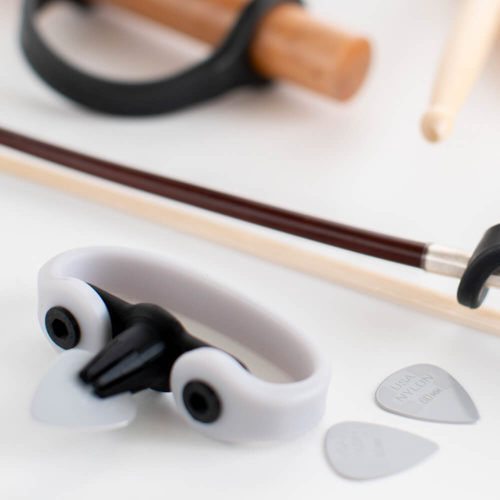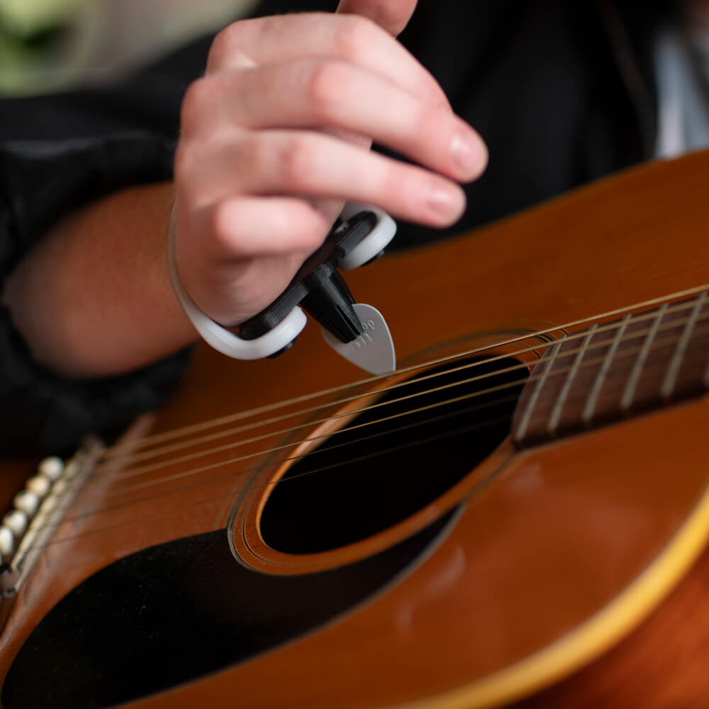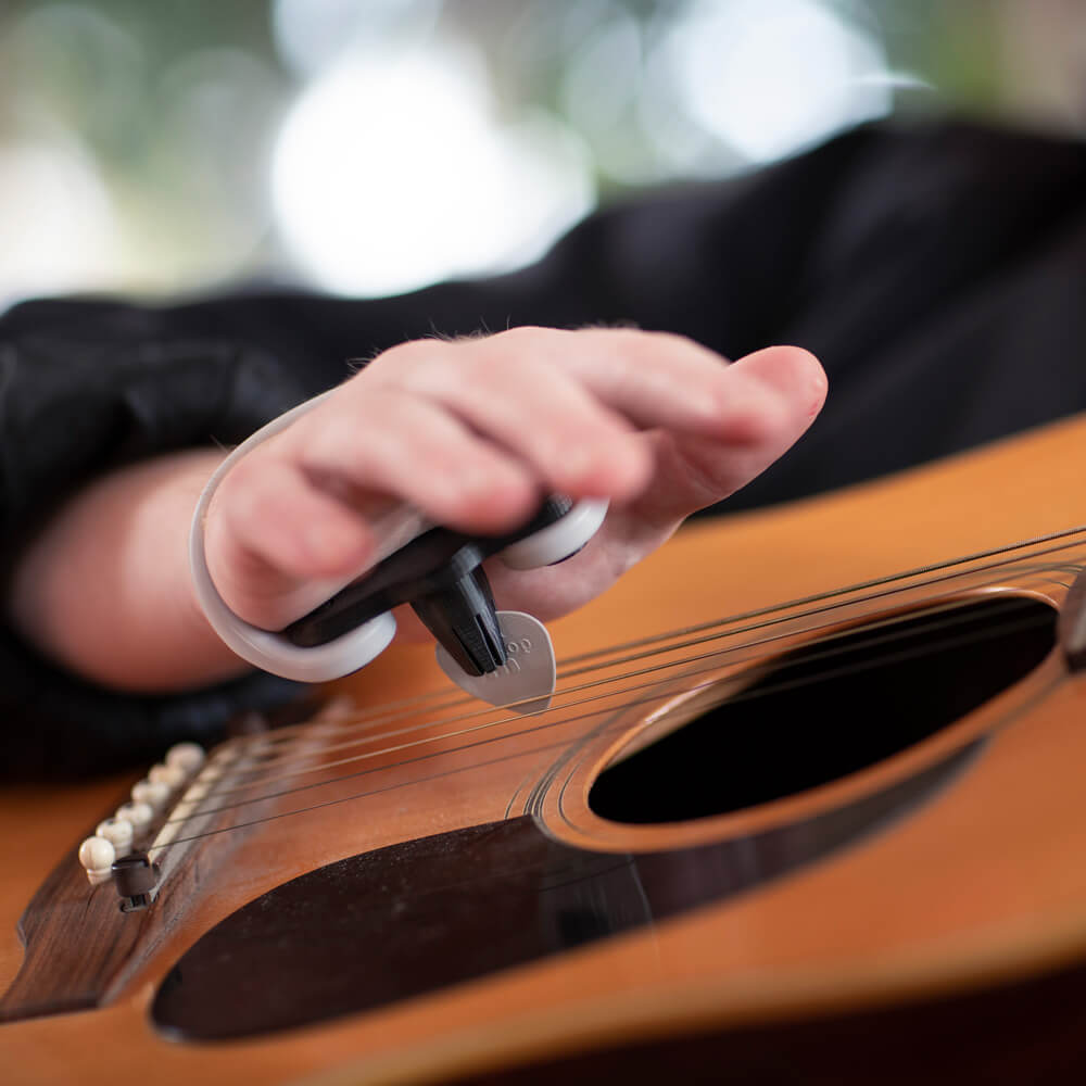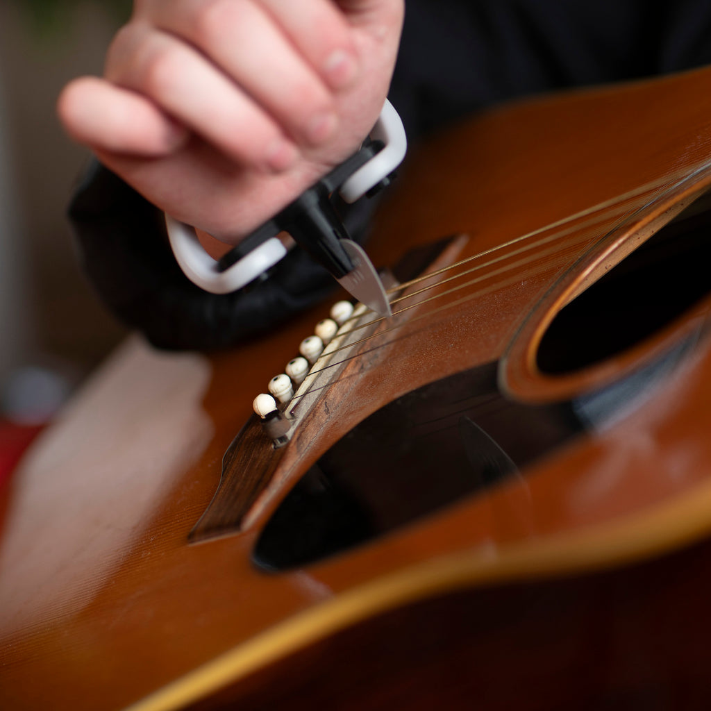 Make music accessible with the Strumling, an adaptive guitar pick holder designed for players of all abilities. The soft, flexible silicone strap fits comfortably around the palm or limb, securely holding the pick in place without the need for a pinch grip. Whether strumming chords, keeping rhythm, or picking individual strings, the Strumling makes it easier for people with limited hand mobility or limb differences to enjoy playing guitar with confidence and ease.